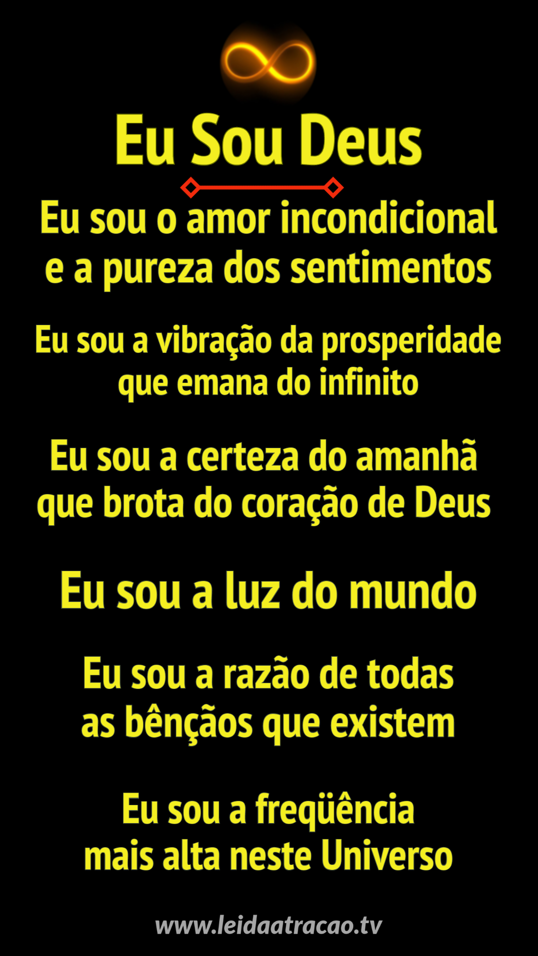 Não se preocupe, apenas repita: EU SOU DEUS e você vai notar como uma força poderosa vai começar a vibrar dentro do seu corpo, porque quando você afirma você assume o seu papel de Deus na parcela da cocriação.