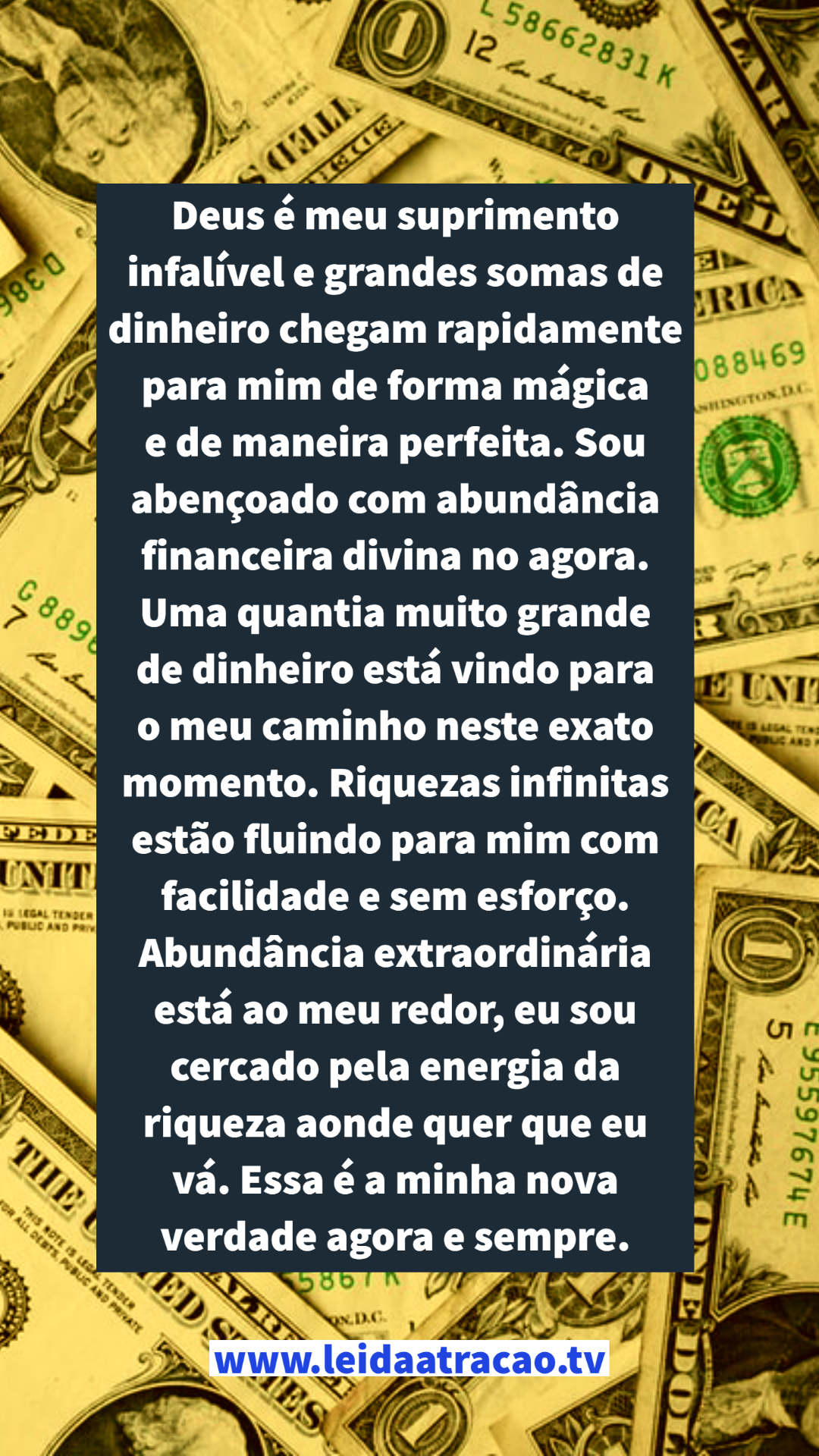 Deus é meu suprimento infalível e grandes somas de dinheiro chegam rapidamente para mim de forma mágica e de maneira perfeita. Sou abençoado com abundância financeira divina no agora. Uma quantia muito grande de dinheiro está vindo para o meu caminho neste exato momento. Riquezas infinitas estão fluindo para mim com facilidade e sem esforço. Abundância extraordinária está ao meu redor, eu sou cercado pela energia da riqueza aonde quer que eu vá. Essa é a minha nova verdade agora e sempre.